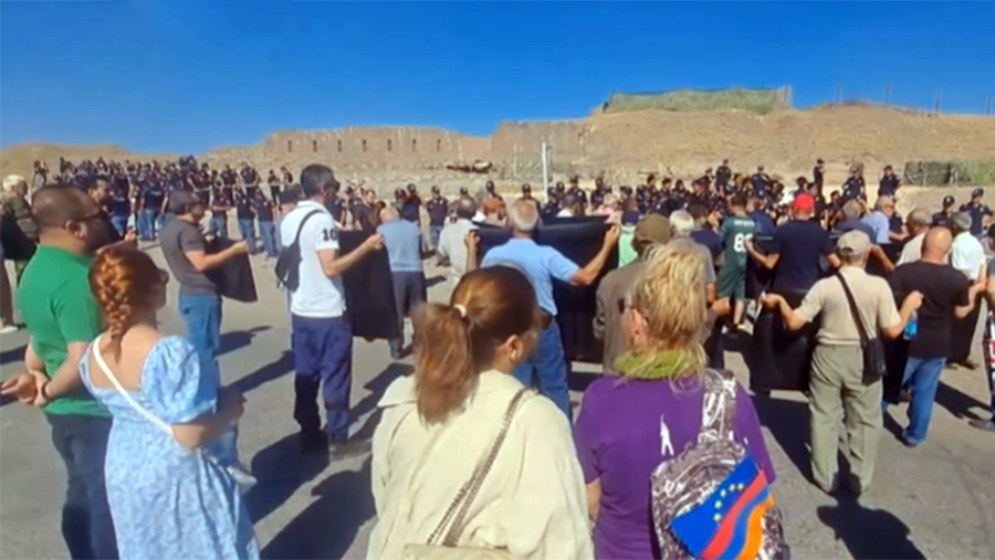 Police are holding a cordon around the perimeter of the base, and protesters with placards are demanding the withdrawal of the Russian military from the territory of Armenia and calling them a threat to the country.