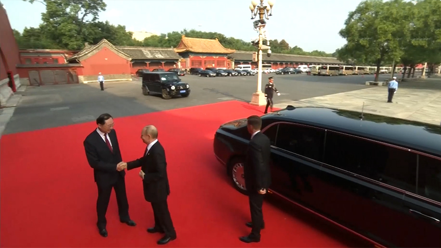 Vladimir Putin arrives at Tiananmen Square for the Victory Day Parade in Beijing