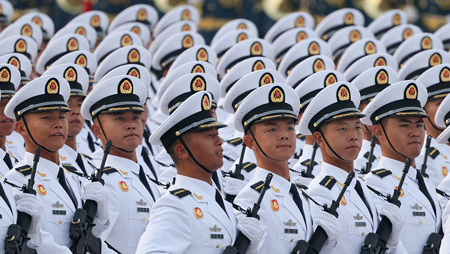Cyberspace troops and information support troops of the People's Liberation Army of China take part in a parade in Beijing on September 3 for the first time on the occasion of the 80th anniversary of the victory over militaristic Japan and the end of World War II.