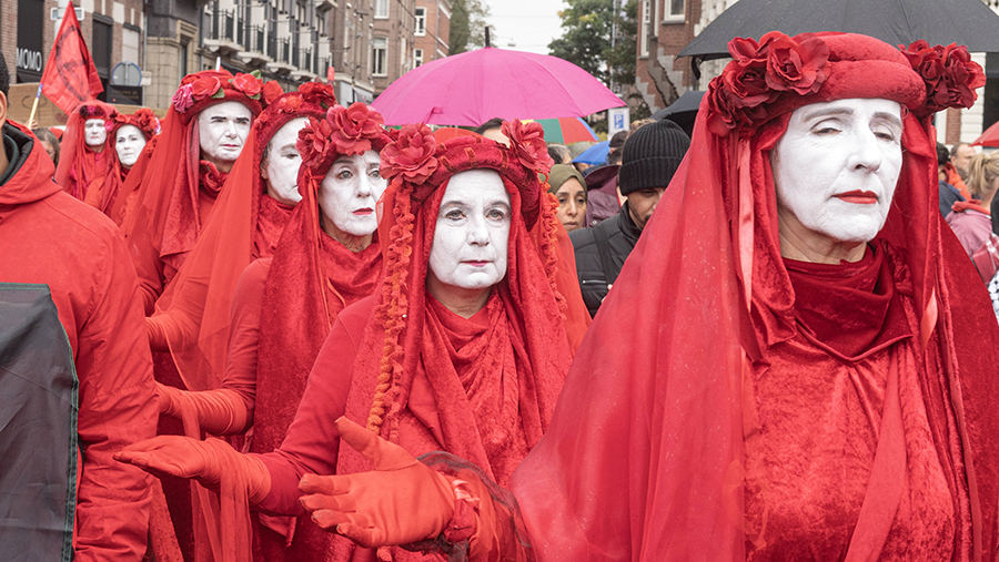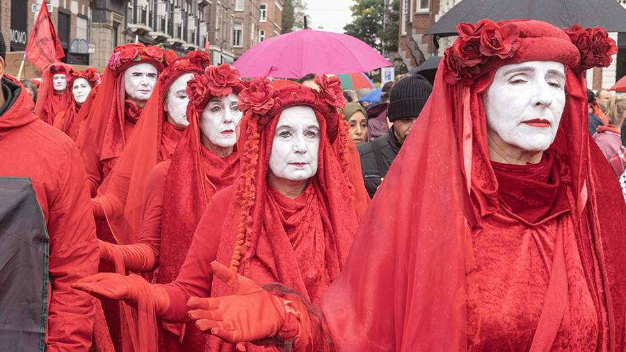 It is noted that the protesters were dressed in red clothes and demanded that the Dutch government confront Israel in order to "stop the genocide in Gaza."