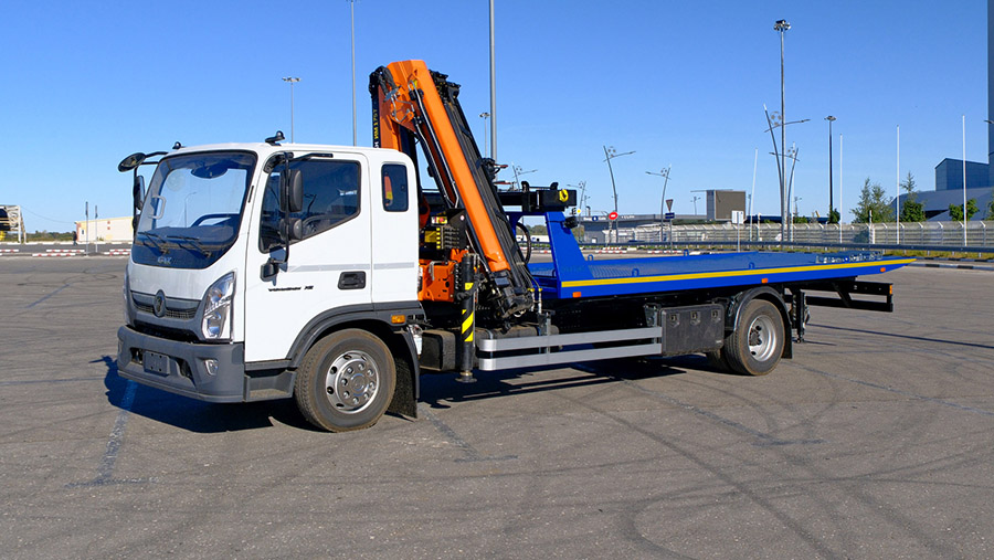 The model was built with the Nizhny Novgorod company Smarteco-NN on a Valdai 12 chassis with a 4x4 wheel formula and a diesel engine. The truck is equipped with a 5950 mm long sliding platform with a hydraulic system, a lentil anti-slip coating, six mounting points and a set of fasteners for transported vehicles. The design includes a winch with a lifting capacity of 4 tons, rear outriggers, work area lights and a magnetically mounted beacon.