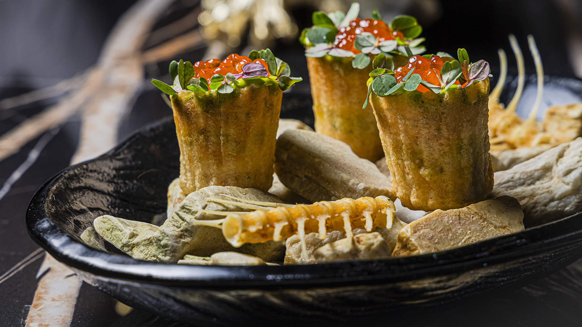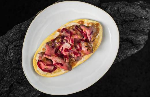 The chef elegantly complements the baked sea urchin with northern shrimp with parmesan mousse and bone marrow biscuits, and tuna tartare is hidden inside a peeled pickled tomato laid on a pillow of shichimi pepper cream. Marinated sardines floating in miso oil have a sweet accent in the form of spicy raisins. Crumpets made from black onions are smoked on wood chips right in front of the guests, and then dipped into a delicate cream with black caviar.
