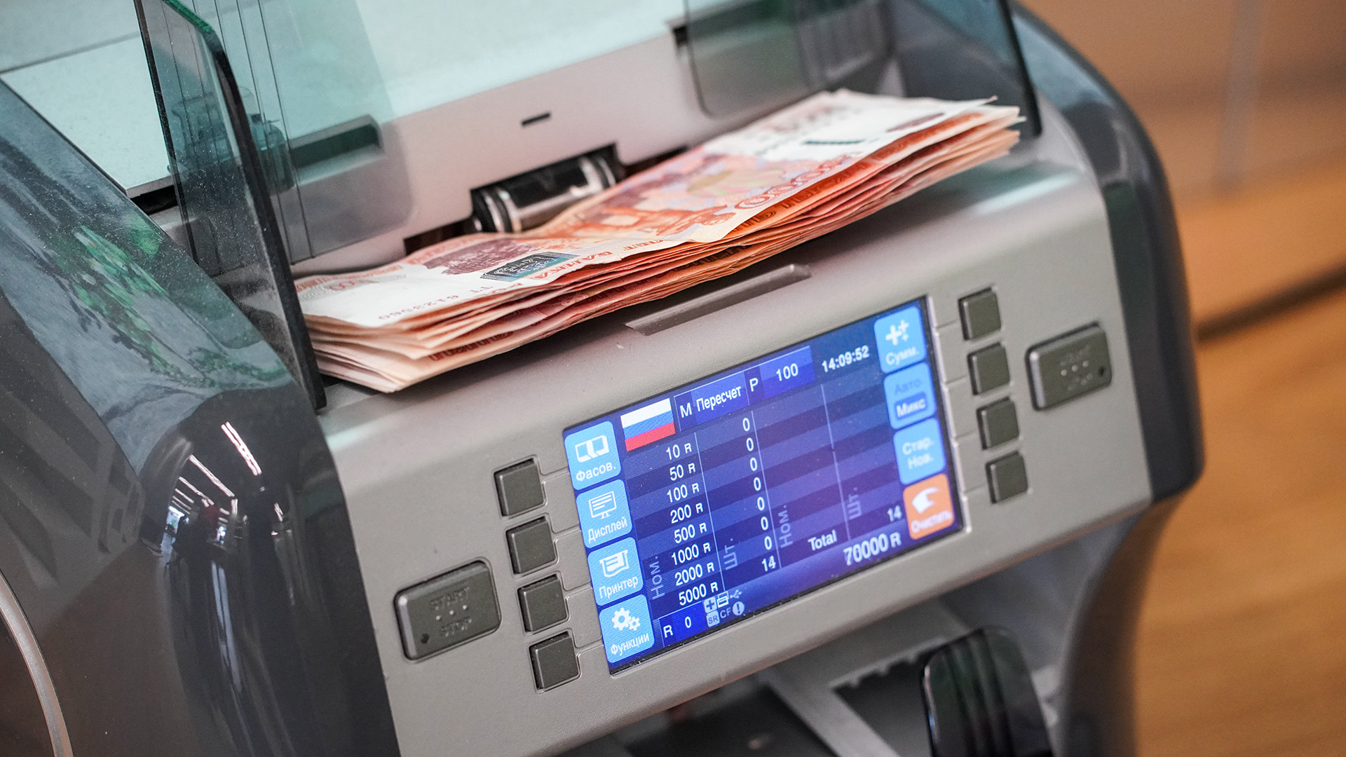 Сотрудник банка пересчитывает купюры различного номинала