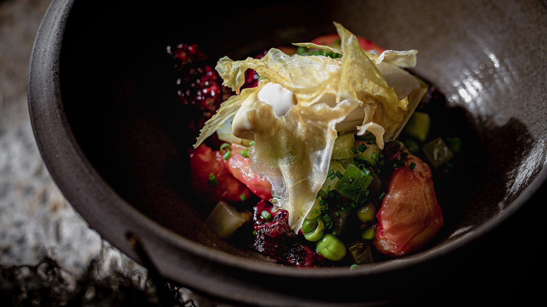 Masha's steak is served with crispy cabbage chips and a rich demiglace of fried cabbage leaves. The dish is accompanied by pea jelly, which slightly resembles hummus, and popcorn made from boiled, dried and exploded peas. The third ingredient is onions in two textures (fried onion mousse and onion marmalade). As a result, the simplest ingredients — cabbage, onions, peas — make a very gastronomic dish.