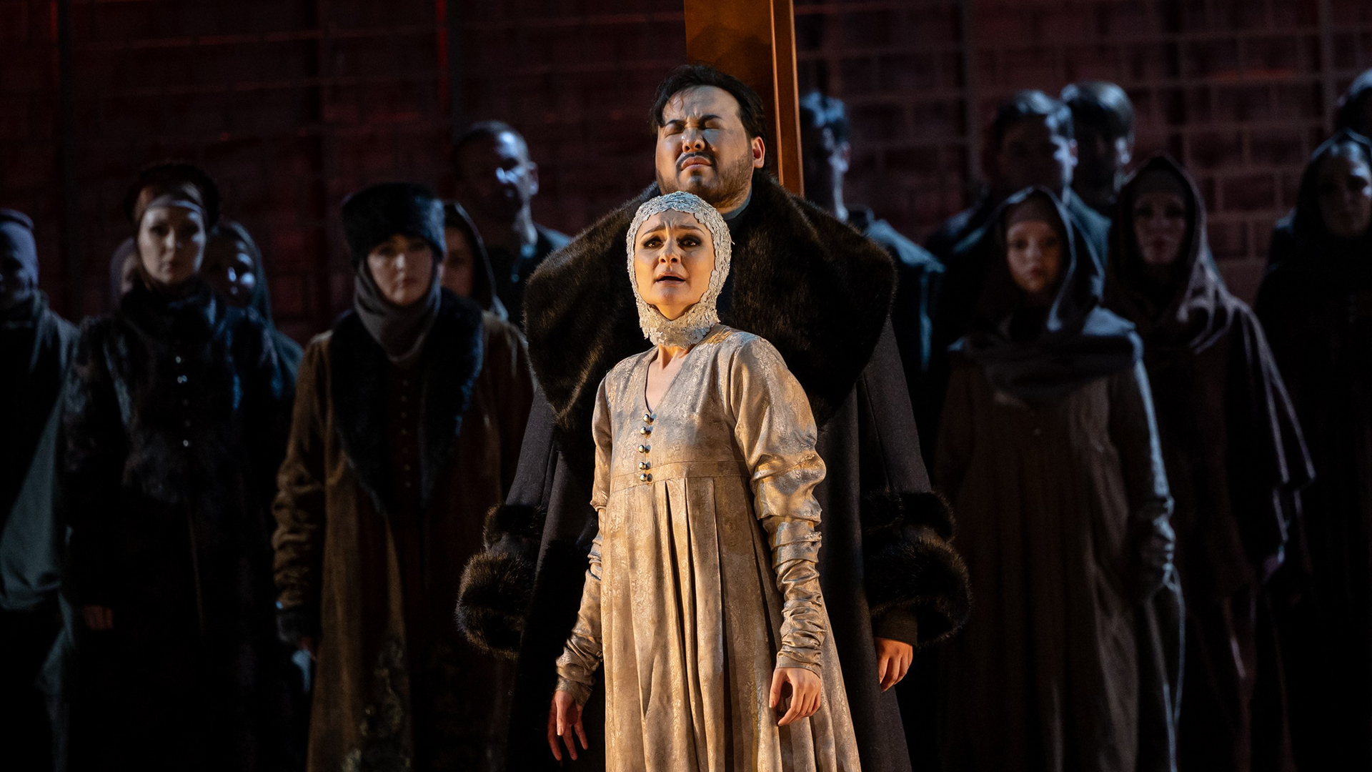 The opera opened with the credits. Several historical facts were brought out on the black backdrop: "The marriage of Ivan the Terrible with Marfa Sobakina is shrouded in a dark mystery," "The wedding took place in the autumn of 1571. But two weeks later, the queen died," "Poisoning was named as the cause of death. There were various legends about possible killers..."