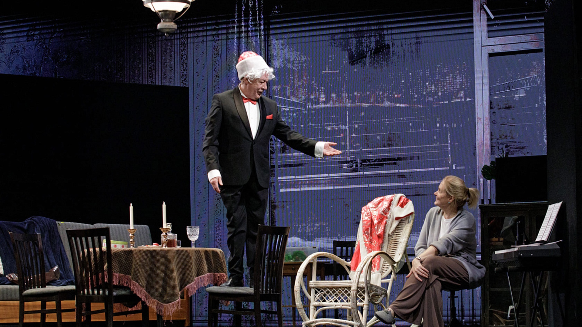 At some point, the ex-spouse decides to take the bull by the horns and strips down to his underpants. But it only scares the woman. In the heat of the moment, the couple demolishes the apartment. Chairs were smashed, a Christmas tree was knocked down, curtains were torn off. But it was interesting to follow these family squabbles. The two masters on stage were sparkling and hissing like champagne. It's like there haven't been several years without a profession. It was as if Mikhail regularly appeared on the stage of Sovremennik. And Anna is organic herself. The scene suits her very well.