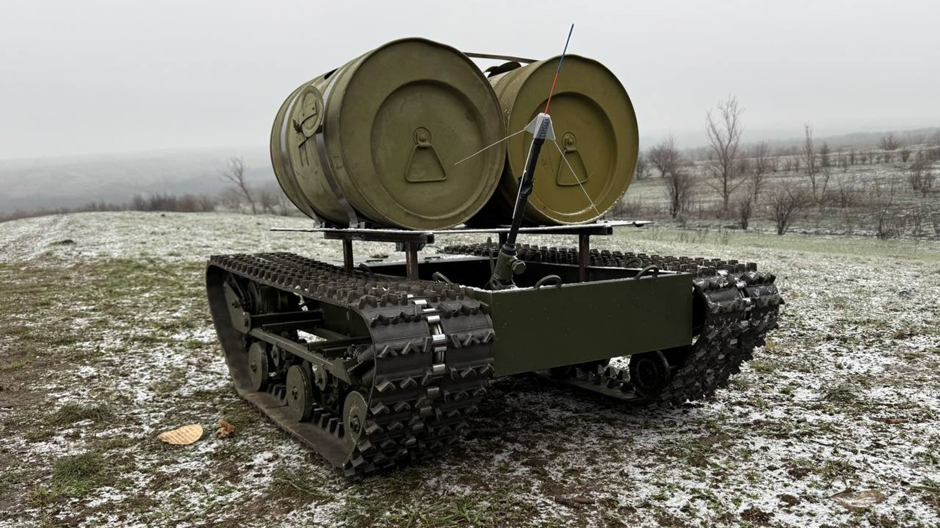 The new ground-based robotic complex (NRTC) "Veil" is a universal tracked platform "Torpedo", on which two large smoke bombs are mounted. They are designed to install a camouflage plume on the battlefield or in the rear areas.